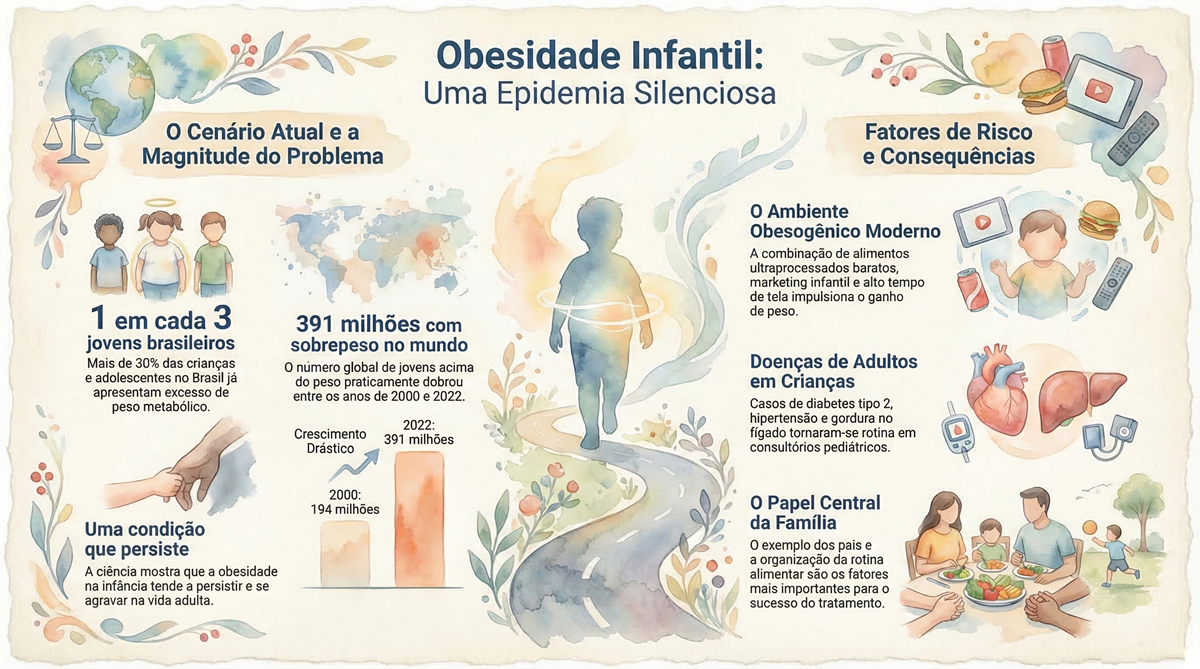No Brasil, o cenário também é preocupante. Diversas revisões sistemáticas indicam que aproximadamente 12% das crianças brasileiras já apresentam obesidade, com números ainda maiores quando se inclui o sobrepeso.